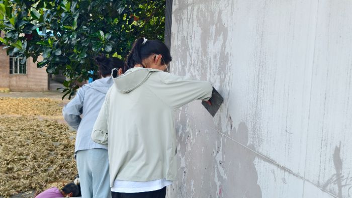 下午,成员们用村民热心提供的工具仔细刮掉旧墙绘,确保新墙绘的基底平整、干净。接着手持滚筒涂刷白色颜料,覆盖难以刮除的残留痕迹。经过一下午的努力,墙面焕然一新,为后续墙绘工作打下了坚实基础。