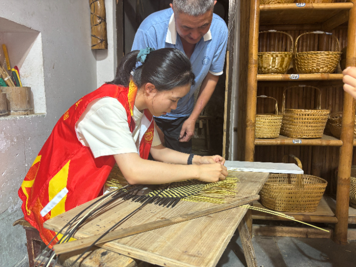 对面老屋里,县级非物质文化遗产传承人叶怡长正聚精会神地编着竹匾,篾条在他指间灵活跳动,很快一个“福”字跃然“竹”上。“砍、锯、切、剖、拉、撬、编、织、削、磨是篾匠入行的基本功。我们讲究精细二字。”叶师傅一边讲解,一边指导实践团队员彭萱体验竹编手艺。