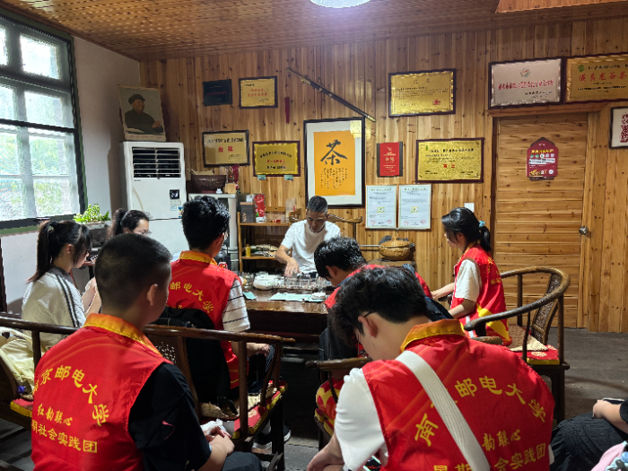 交流过程中,最让实践团感兴趣的是这工坊的两个“金字商标”——“乌溪红”和“月光峰”的出处来自粟裕将军的夫人楚青作的一首诗:当年鏖战此山中,热血染得乌溪红。鱼水相依深情在,浩气长存月光峰。这给实践团带来了启发,针对品牌弱、销路窄的现存瓶颈,建议结合红色典故,组织团队设计融入革命元素的统一包装,如印制革命历史简介或二维码链接故事;策划“茶园生态游”,专门划分一片茶园让游客参与采茶、制茶体验,联动红色研学路线形成闭环。