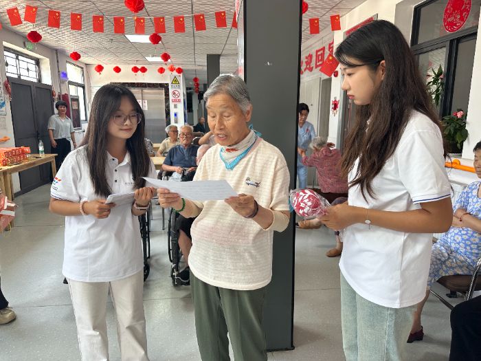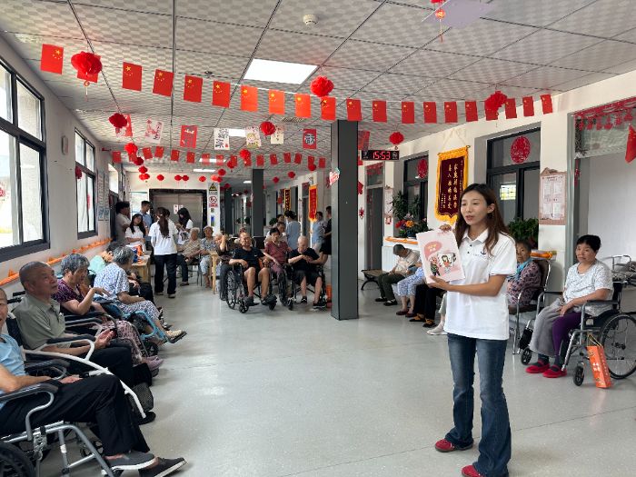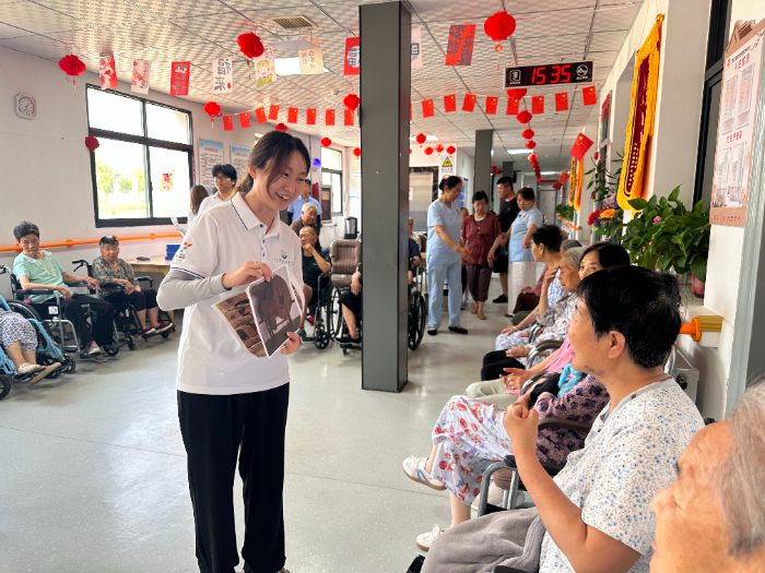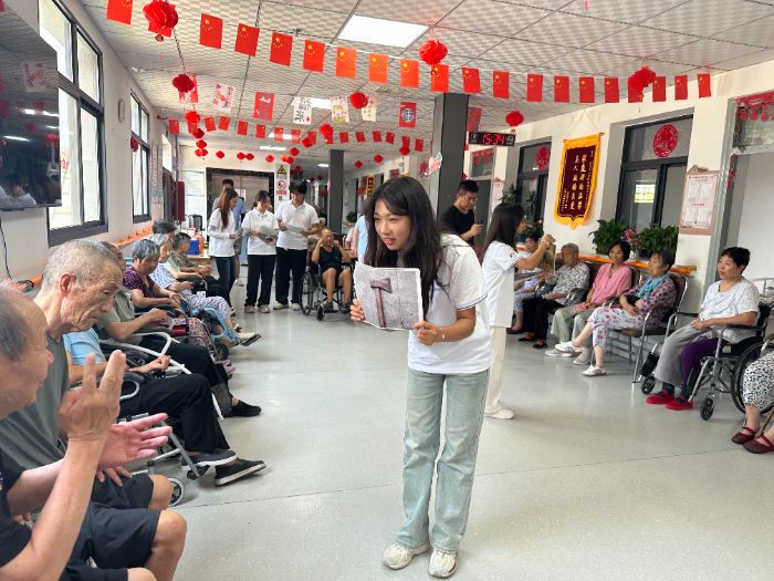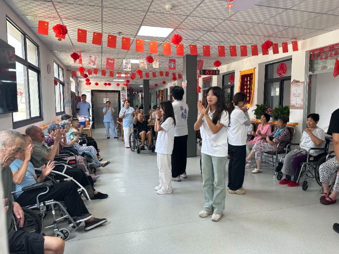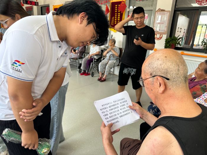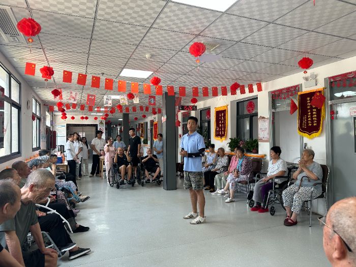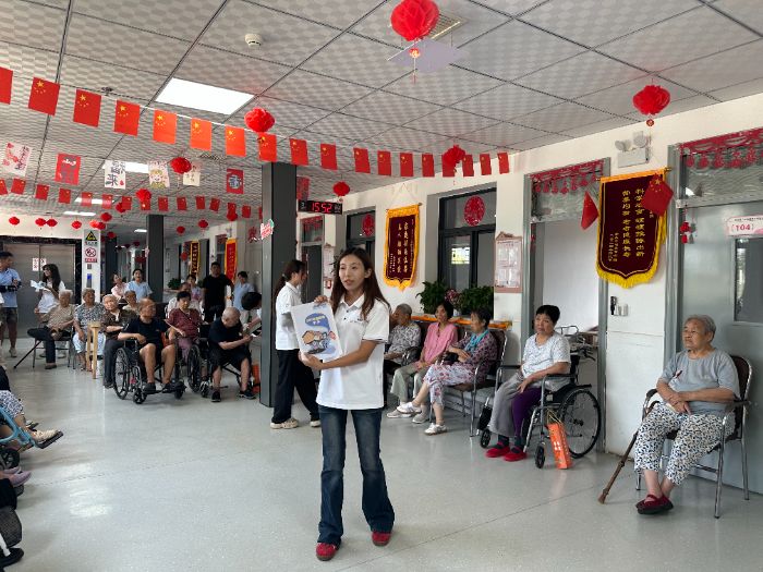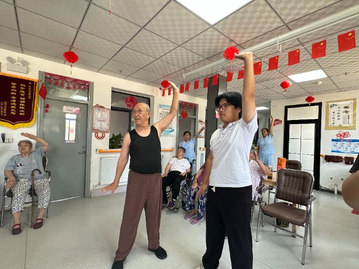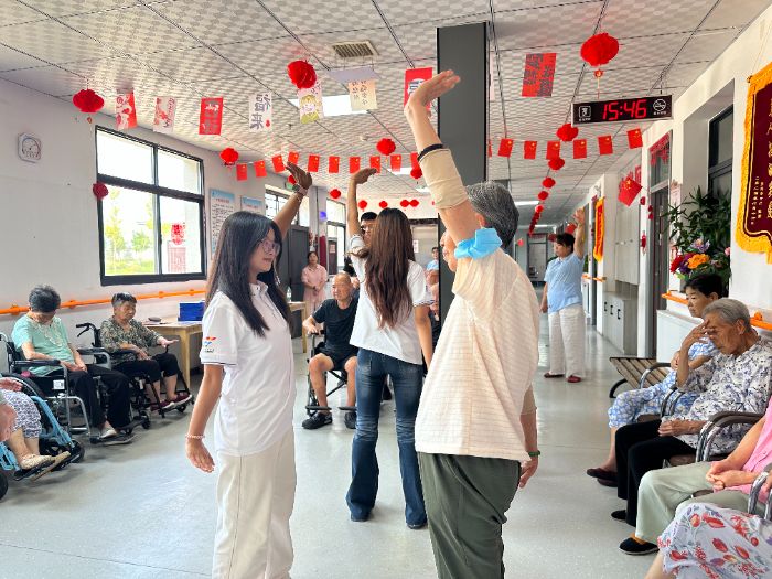 最后,实践团队充分发挥自身优势,开展了一系列养老助老活动。实践队员们以生动鲜活的形式推广普通话,助力提升老年群体沟通效能;耐心示范并带领开展手指操,通过科学运动促进肢体健康;现场传授八段锦养生功法,引导养成健康生活方式;结合典型案例解析金融反诈知识,筑牢老年群体财产安全防线。活动现场互动踊跃、暖意融融,老人们积极参与其中,充分感受青年学子传递的关怀与朝气。