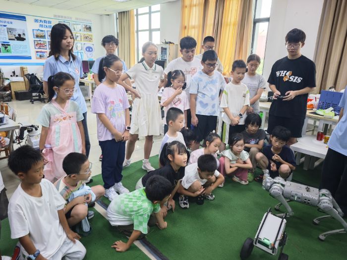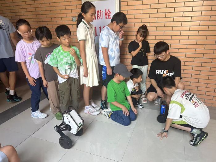 图为实践队员进行机器人科普介绍 科技展魅力 互动零距离 在实践队员的带领下,小朋友们走进机器人创新实验室,沉浸式体验前沿科技的魅力。活动现场,小朋友们近距离观摩宇树机器狗GO1与轮足机器人的精准演示,并在实践队员的指导下亲手操作,通过遥控指令让机器人完成行走、转向等基础动作。这种互动式学习不仅让小朋友们直观感受到人工智能技术的运作原理,更在欢声笑语中播撒下科学探索的种子,有效激发了小朋友们对智能科技的好奇心与求知欲。