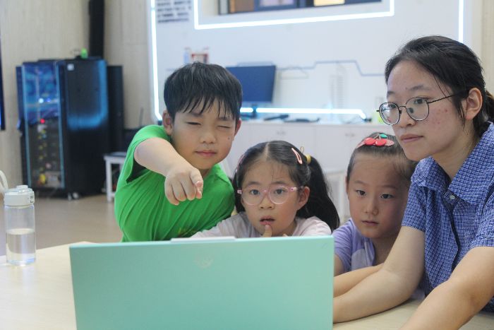 图为小朋友们正在调试机器人舞蹈程序