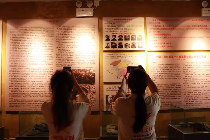 陈列馆内,被硝烟熏黑的《中国工农红军总政治部布告》仿品记录下了布依族老人杨登凤和红军的故事。1935彭德怀、杨尚昆同志率部队抵达贵州镇宁县版袍村时,杨登凤被红军的严明纪律所感动,主动为其提供食宿并协作他们进行宣传,红军走后,他秘密保存红军布告,并在1952年上交贵州省人民政府。此外陈列馆内还记录着许许多多红军和人民的故事,队员们被这些鲜活的红色故事深深打动,纷纷表示要继承和发扬红军精神,把红色基因融入新时代的青春奋斗中。