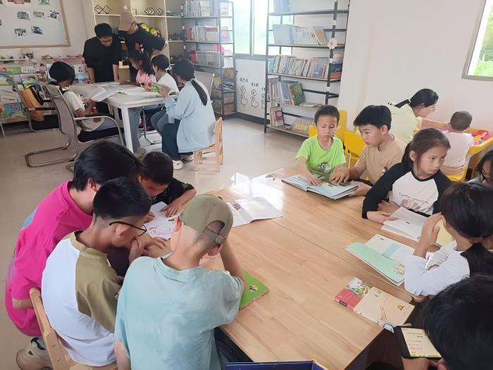 夜幕下的高桥书屋,成为孩童们的“语言加油站”。志愿者们俯身教学,为孩子们纠正发音,在“春”“夏”的平仄中感受语言韵律,在“家乡”“梦想”的念诵中建立表达自信;对普通话流利的孩子,志愿者则化身课业辅导者,耐心解答习题疑难,让书屋成为播撒自信的土壤。