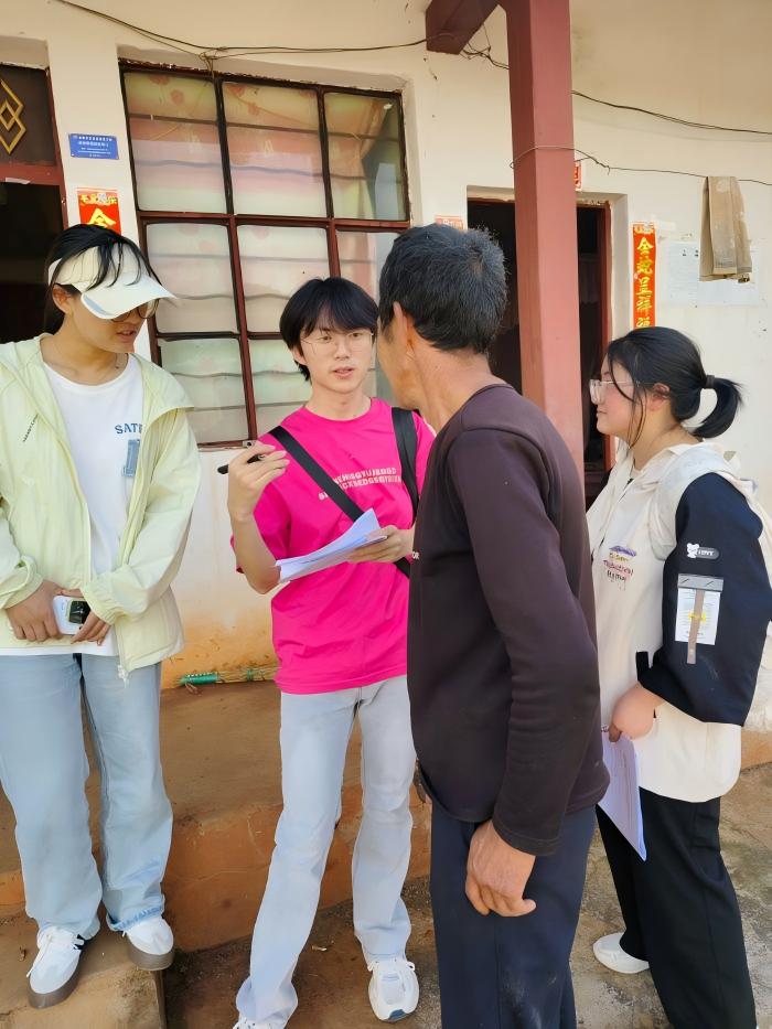 图为队员罗婷、刘宇和陈清才访谈养牛户,并纠正其普通话发音。彭鑫浩 供图