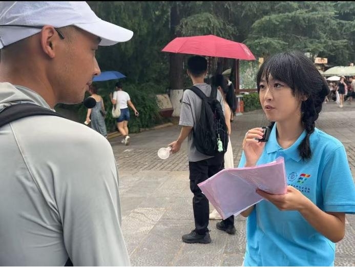 游客互动:传递古建力学科学价值 7月12日,实践团成员们积极与明孝陵的游客进行访谈交流,内容涵盖明孝陵的历史文化背景和建筑结构特点。团队成员们运用通俗易懂的语言,在访谈的过程中向游客们介绍明孝陵建筑中的力学知识,从石材的承重原理到拱券结构的分力机制,从建筑群的抗震设计到排水系统的流体力学应用,都被生动地呈现出来。 许多游客表示,通过河海学子的专业讲解,他们不仅了解了明孝陵的历史价值,更深刻认识到古建筑中蕴含的科学智慧。