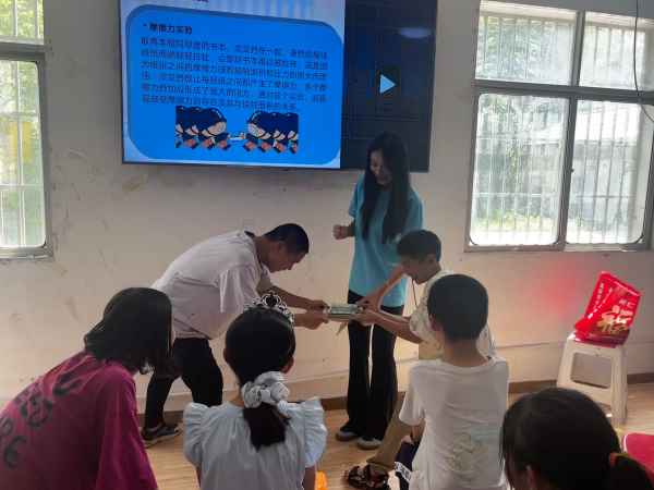 下午,实践团队开展了科学主题教育课。团队队员运用精心筹备的课件、踊跃的问答环节、精彩的动画演示以及有趣的科学小实验,深入浅出地为孩子们普及科学知识。在做摩擦力书本实验时,珊珊好奇地问:“老师,为什么把两本书的书页交叉在一起就很难拉开呀?”队员耐心地解释着原理。讲解过程中,孩子们被一个个奇妙的科学现象所吸引,积极踊跃地回答问题,与实践队员互动频繁。“我知道了,这就是摩擦力的作用!”储梦怡大声说道。这种寓教于乐的方式,让孩子们在轻松愉悦的氛围中领略到科学的魅力,激发了他们对科学知识的浓厚兴趣。