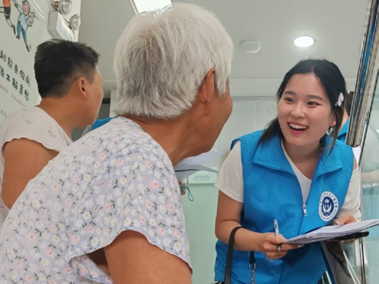 三下乡实践途中,队员们偶遇两位奶奶。一名队员主动上前,细致演示了本次义诊的服务项目,两位奶奶听后便跟随队员前往体验中医义诊,还配合完成了健康问卷调查。离别时,一位奶奶满是感动,紧紧握着队员的手说:“真是太感谢你们了,专门到这儿来,给我们送来了健康!”