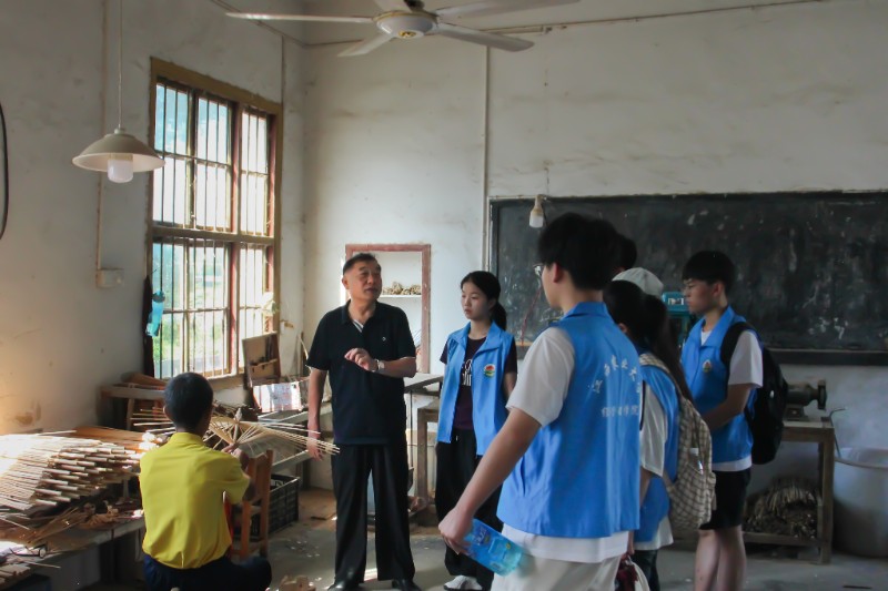 图为戴根盛师傅向实践队员讲解伞骨制作过程(供图:施邵鹏)