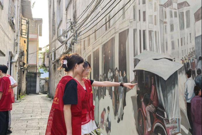 图为成员鉴赏骑楼街壁画。吴敏松供图