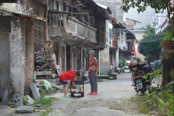 图为骑楼街一角祖孙天伦之乐的画面。夏莹供图
