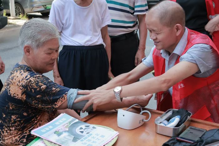 与此同时,在义诊服务区,志愿者们细心搭建起温馨的诊疗空间。“奶奶,您的血压有点偏高,平时要注意低盐饮食哦。”志愿者小高一边轻握着李奶奶的手腕测量血压,一边柔声叮嘱。李奶奶专注地听着,不时点头回应:“原来咸菜要少吃啊,孩子们讲得真明白!”她布满皱纹的手轻轻拍着志愿者的手背。阳光、笑脸、轻声的叮咛交织在一起,绘就了一幅医者仁心、老有所依的动人画卷。每一个细致的问诊,每一句暖心的嘱咐,都在诉说着青年学子对长者最真挚的关怀。