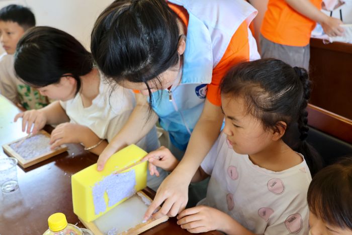 7月16日,湖南工商大学“望山”青禾服务队在湘西州古丈县断龙山镇白溪关村党群服务中心开展了“纸短情长,绿意新生”种子纸手工实践活动。服务队带领当地30余名青少年学习“废纸回收利用”知识,通过亲手制作种子纸,引导孩子们在动手实践中触摸绿色发展的脉搏,为乡村播撒低碳振兴与科技赋能的双重希望。