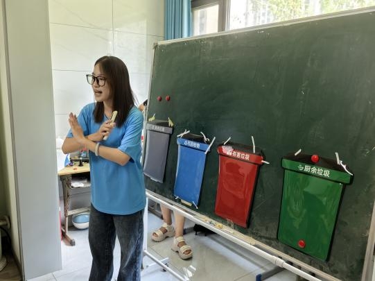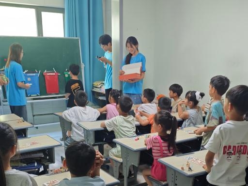 “塑料瓶要放进蓝色垃圾桶!”“果皮是厨余垃圾!”稚嫩而响亮的声音在教室里回荡。针对学龄前儿童认知特点,志愿者团队提前两周设计出“知识讲解+游戏实践”的课程体系,将环保知识与语言训练融入互动游戏中。核心环节聚焦于四个“神奇的垃圾桶”。志愿者将四色垃圾桶模型和对应的分类标志贴于黑板上,用拟人化的语言讲解:“这是蓝色的可回收垃圾桶,它‘喜欢吃’玻璃罐、纸箱、旧书本、旧衣服和塑料瓶,因为它们可以变废为宝!”“绿色的厨余垃圾桶‘最喜欢’骨头、落叶和剩饭剩菜,它们容易腐烂能变成肥料。”“红色的有害垃圾桶‘爱吃’过期药品、体温计、废旧电池和旧灯泡,它们有毒,要小心处理!”“黄色的其他垃圾桶负责‘解决’橡皮擦、脏纸巾、塑料袋等其他垃圾。”