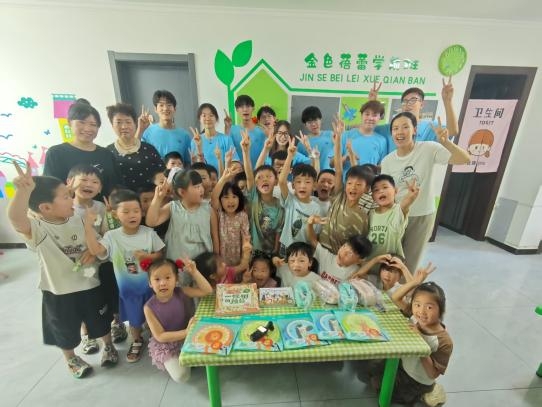 图为实践队推广绿色环保知识及普通话后与小朋友及幼儿园老师合照留念。王彤供图