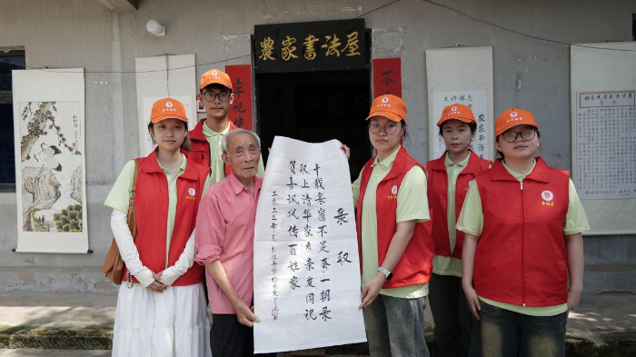 2025年7月1日,重庆城市管理职业学院智慧康养学院“青春筑影·城管有爱”社会实践团走进璧山区八塘镇敢英村,拜访了93岁高龄、党龄71载的老党员书法家杨家发先生。在其倾心打造的“农家书法屋”中,一场穿越岁月的初心对话与艺术传承温暖展开。