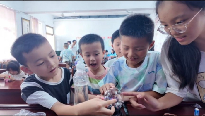 最吸引孩子们眼球的,莫过于趣味科学实验课。当志愿者小心翼翼地操作着简易的实验装置,水中缓缓升起一串串晶莹的气泡时,孩子们的小脑袋立刻凑拢过来,好奇的目光紧紧追随。课间,五彩的卡纸在孩子们手中翻飞,变成了承载想象的“小兔子”、“小青蛙”,世界仿佛在指尖重现。