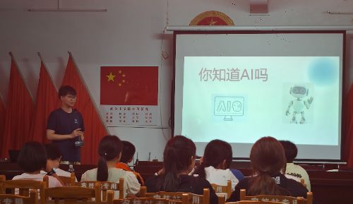 图为团队志愿者在乡村教室为孩子们讲授人工智能基础知识,激发孩子们的科技兴趣。