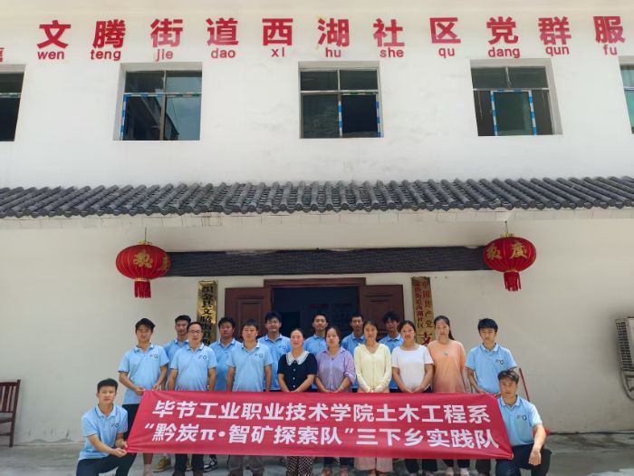 当天下午,黔炭π·智矿探索队又来到文腾街道西湖社区开展"校社共建"活动。队员们带着精心准备的礼物,包括镌刻着"毕节工业职业技术学院教育实践基地"字样的荣誉牌匾和写着"实践基地启新知 社区情深助成长"的锦旗。在社区广场上,队员们拉起了一条醒目的红色横幅,上面写着"毕节工业职业技术学院土木工程系黔炭π·智矿探索队"三下乡实践队的白色大字。社区负责人热情接待了来访的师生团队,在社区会议室里,双方就未来在志愿服务、文化宣传、技能培训等方面的合作事宜进行了深入细致的交流探讨。活动最后,全体队员与社区工作人员在鲜艳的横幅前合影留念,用相机记录下这意义非凡的时刻,为当天的活动画上了圆满的句号。