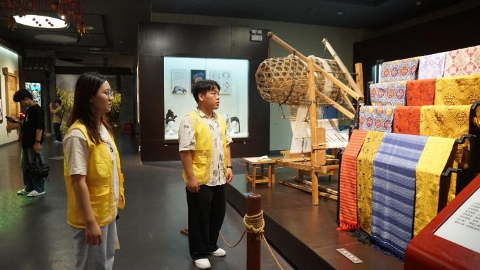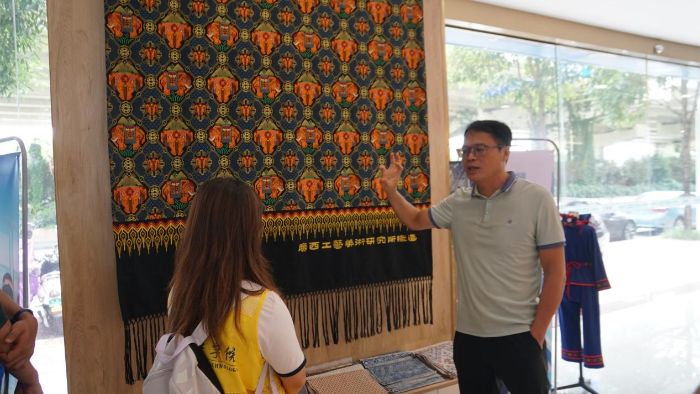 图1为广西工艺美术研究院负责人为团队成员讲解壮锦纹样 李东泽 供图