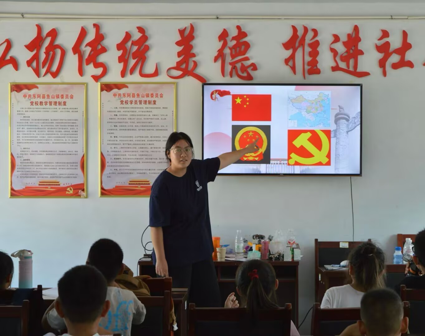 七月的聊城,蝉鸣伴着琅琅书声,烟育菏梦支教队的支教进程已至第六天。在稳步推进文化课教学的同时,支教队员们特意为孩子们增设了一堂国防安全教育课。红色的教育挂图在教室后排整齐铺开,队员们精心准备的课件上闪烁着国防知识的光芒,孩子们挺直的腰板与专注的眼神,共同勾勒出一幅浸润着家国情怀的生动画面。