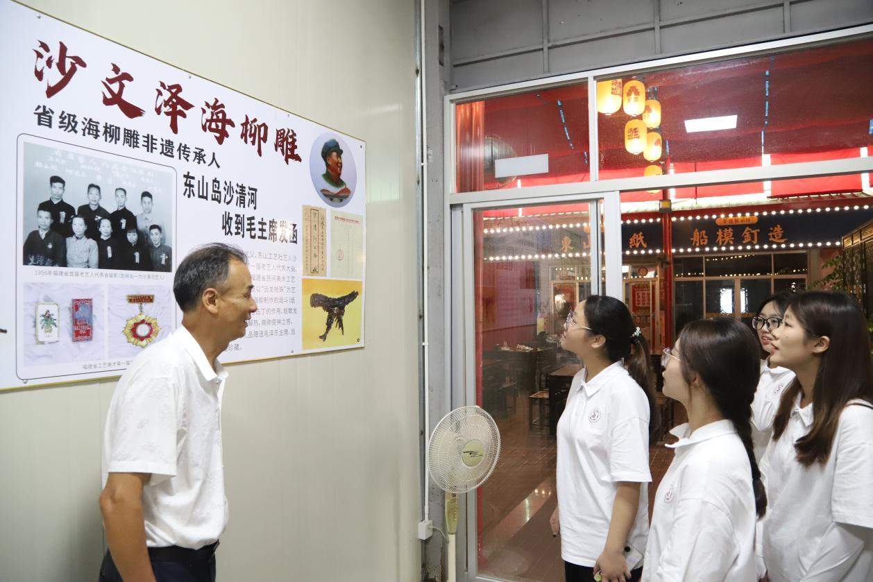 在东山华福书院的海峡两岸非遗艺术展上,大陆与台湾地区的非遗精品同台亮相。剪瓷雕的斑斓、铁枝木偶的灵动,与台湾的蝶影画作、民俗手工艺交相辉映,每一件展品都是闽海文脉同根同源的见证。队员们深刻体会到,东山岛的文化不仅是地域的瑰宝,更是连接两岸同胞的“精神脐带”,青年当以文化为桥,让这份跨越山海的共鸣持续传递。
