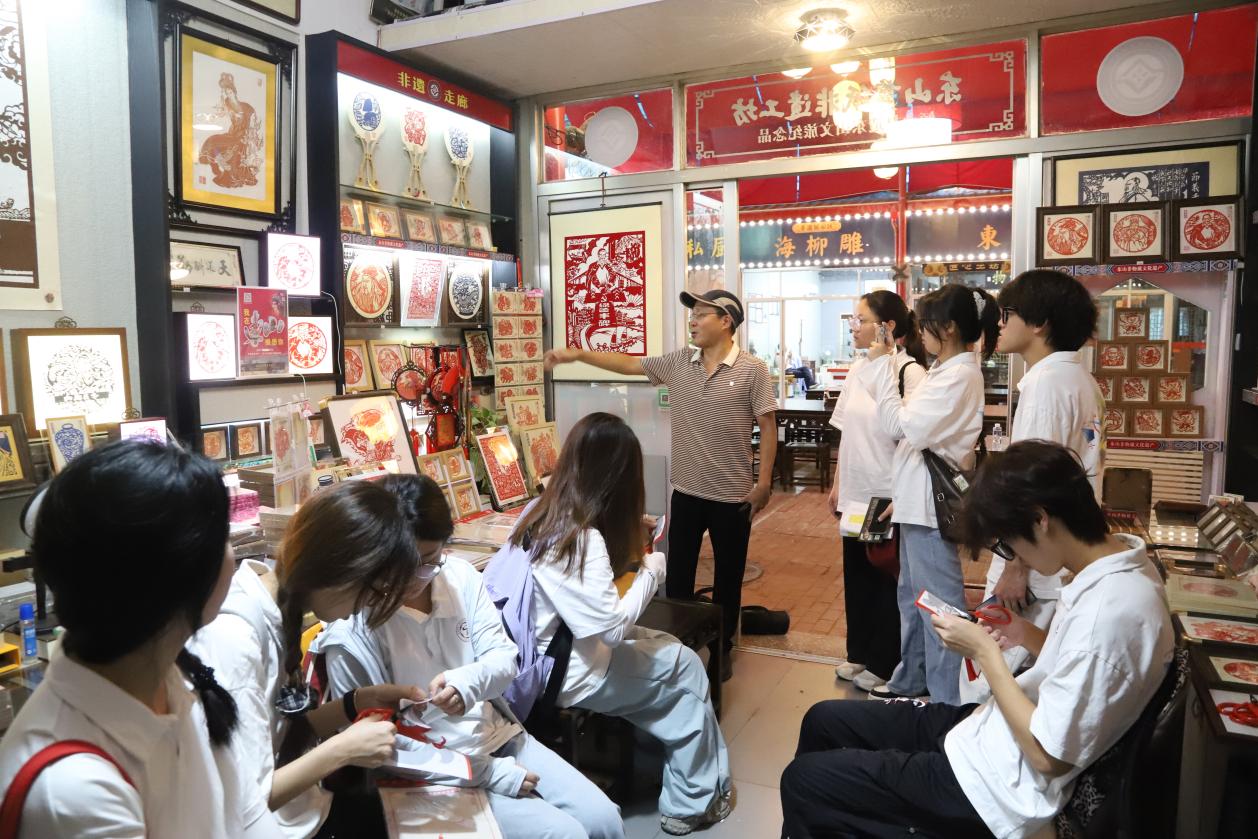 图为剪纸非遗传承人程金铭老师为实践队成员讲解剪纸作品。张炳涛 供图