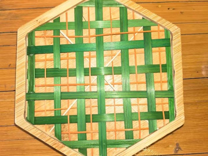 图为实践队队员制作的穿篾十字编杯垫。罗娇杨摄