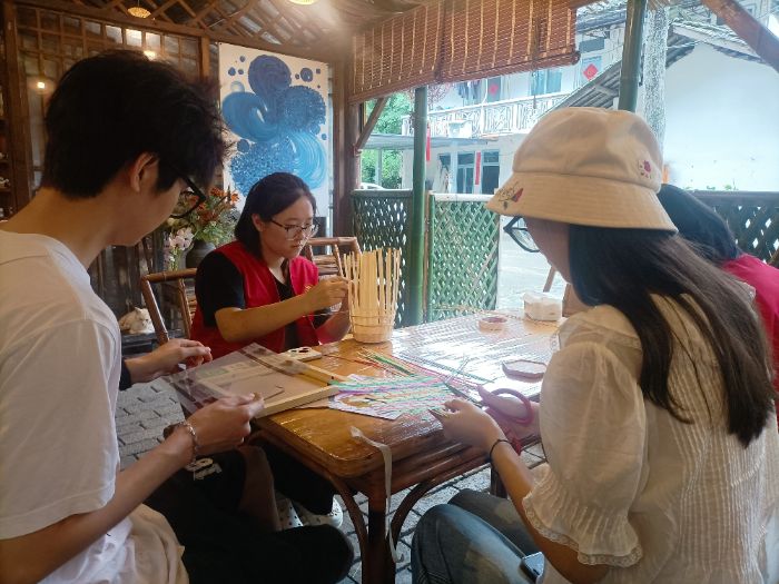 图为实践队队员在进行竹编制作时互相讨论沟通。罗娇杨摄