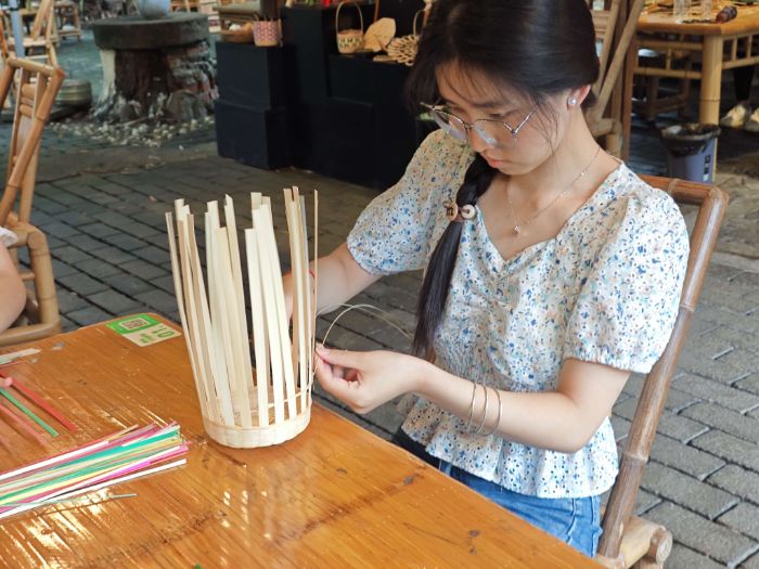 图为实践队队员自己进行各项竹编作品的操作学习。罗娇杨摄