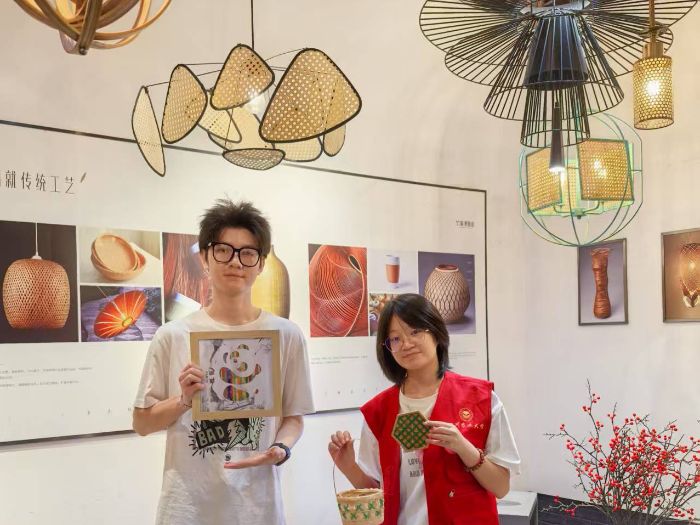图为实践队队员制作的作品与新式竹编灯具的合影。罗娇杨摄