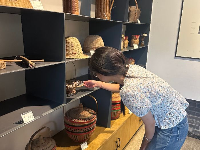 图为实践队队员在探访参观道明村的竹编文化展览。罗娇杨摄
