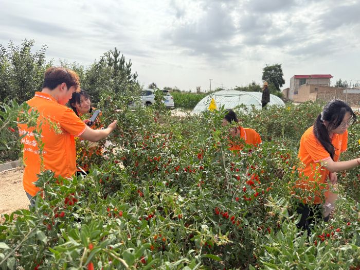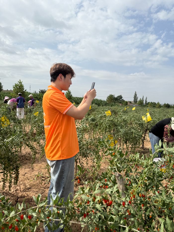 7月15日上午,兰州理工大学生命科学与工程学院"红耀兴农先锋队"联合清华大学、对外经济贸易大学实践团队,在靖远县团委张琦书记的陪同下,深入五合镇枸杞种植基地开展产业调研。三校学子以跨学科视角,通过实地考察、农户访谈、样本采集等方式,系统调研从种植、加工到销售的枸杞全产业链发展现状,共同探寻"甘味"农产品品质提升与品牌建设的创新路径,为特色产业赋能乡村振兴贡献青年智慧。