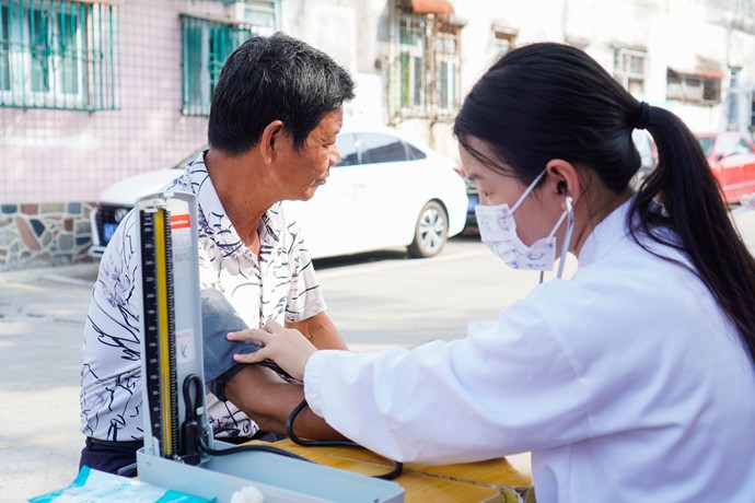 负责血压测量的队员认真细致,为乡亲们筑牢健康的血压防线。