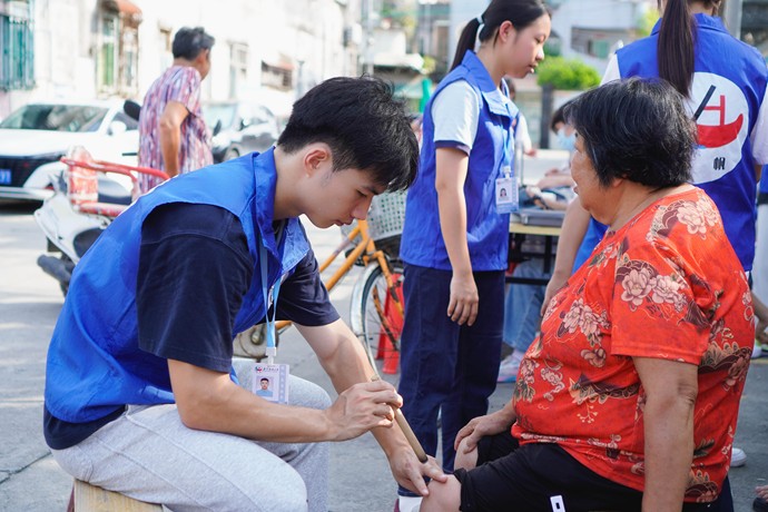图为义诊时志愿者对老人进行艾灸 张灏 摄