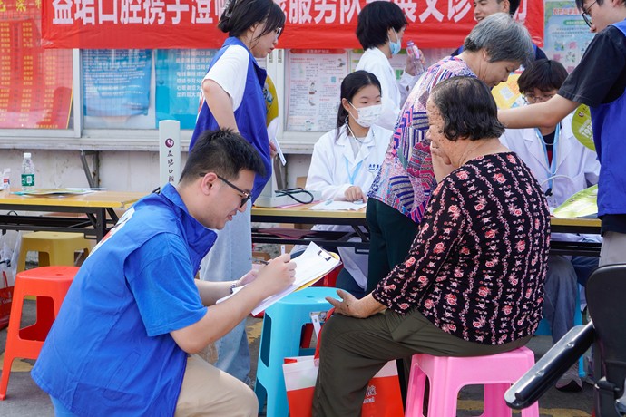 图为义诊时志愿者对老人进行调研 张灏 摄