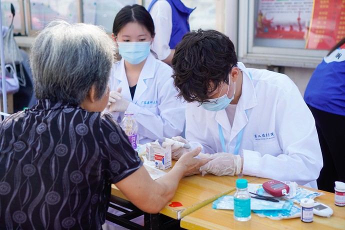 图为义诊时志愿者对老人测血糖 张灏 摄