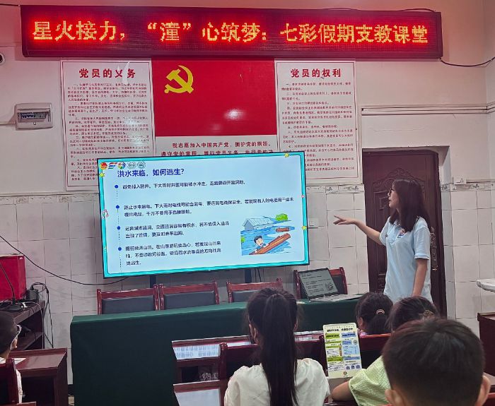一、理论课堂干货足,应急技能全解锁 课堂上,实践团成员杨琳以生活中常见危险场景为切入点,系统讲解应急避险知识。如地震逃生、洪涝灾害,结合实际案例说明如何自救。在火灾防范模块,实践团成员杨琳详解119报警要素——需清晰说明地址、火势及被困情况。防溺水教育中,她通过“六不要”准则明确禁忌:不私自下水、不擅自结伴、无监护不游泳、不去陌生或无安全保障水域,更严禁盲目下水施救,引导孩子们学会“呼救+抛漂浮物”的科学救援方式。
