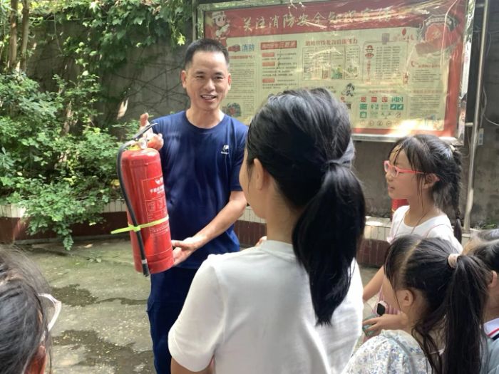 在装备展示区,消防员逐一介绍了空气呼吸器、液压剪、扩张器等抢险工具的用途,尤其重点讲解了灭火器的使用知识。从不同类型灭火器(干粉、二氧化碳等)的适用场景,到 “提瓶身、拔保险销、握喷管、压把手” 的操作步骤,消防员都结合实物进行演示。孩子们还获得了亲身体验的机会,在指导下模拟扑救初期火灾,亲手感受按压把手时的力度与灭火剂喷射的方向,将如何正确使用灭火器的知识从抽象概念转化为具体技能。