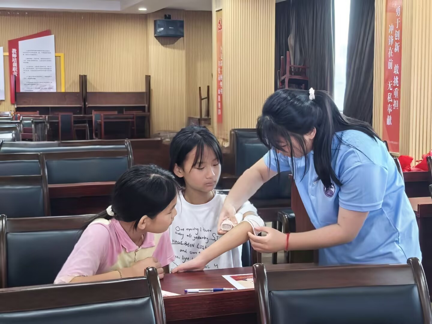 在中乔夏令营和优安纳夏令营的课堂中,队员们化身专业讲师,通过“理论+实操”的立体化教学模式,系统地教授心肺复苏术(CPR)、海姆立克急救法和创伤包扎技能,带领小朋友们分组演练,将急救步骤转化为肌肉记忆。模拟溺水救援、气道梗阻处理等场景,让“小小急救员”们掌握在突发状况下自救互救的关键能力,为生命安全筑起第一道防线。
