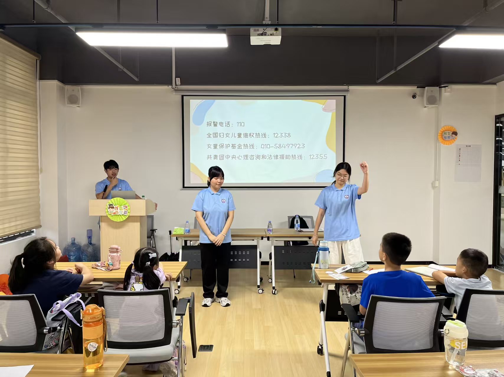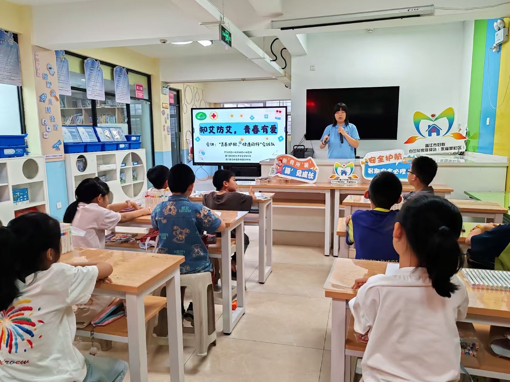 在池店镇状元里社区“党建+”邻里中心和永福里社区新时代文明实践站内,通过“Yes or No”情景游戏和“口香糖粘粘乐”,帮助小朋友们建立身体界限意识。防艾宣讲则结合动画视频和互动问答,科普传播途径与防护措施。实践队将性健康教育与法律知识相融合,让小朋友们在轻松氛围中学会用法律武器保护自己,树立“我的身体我做主”的坚定信念。