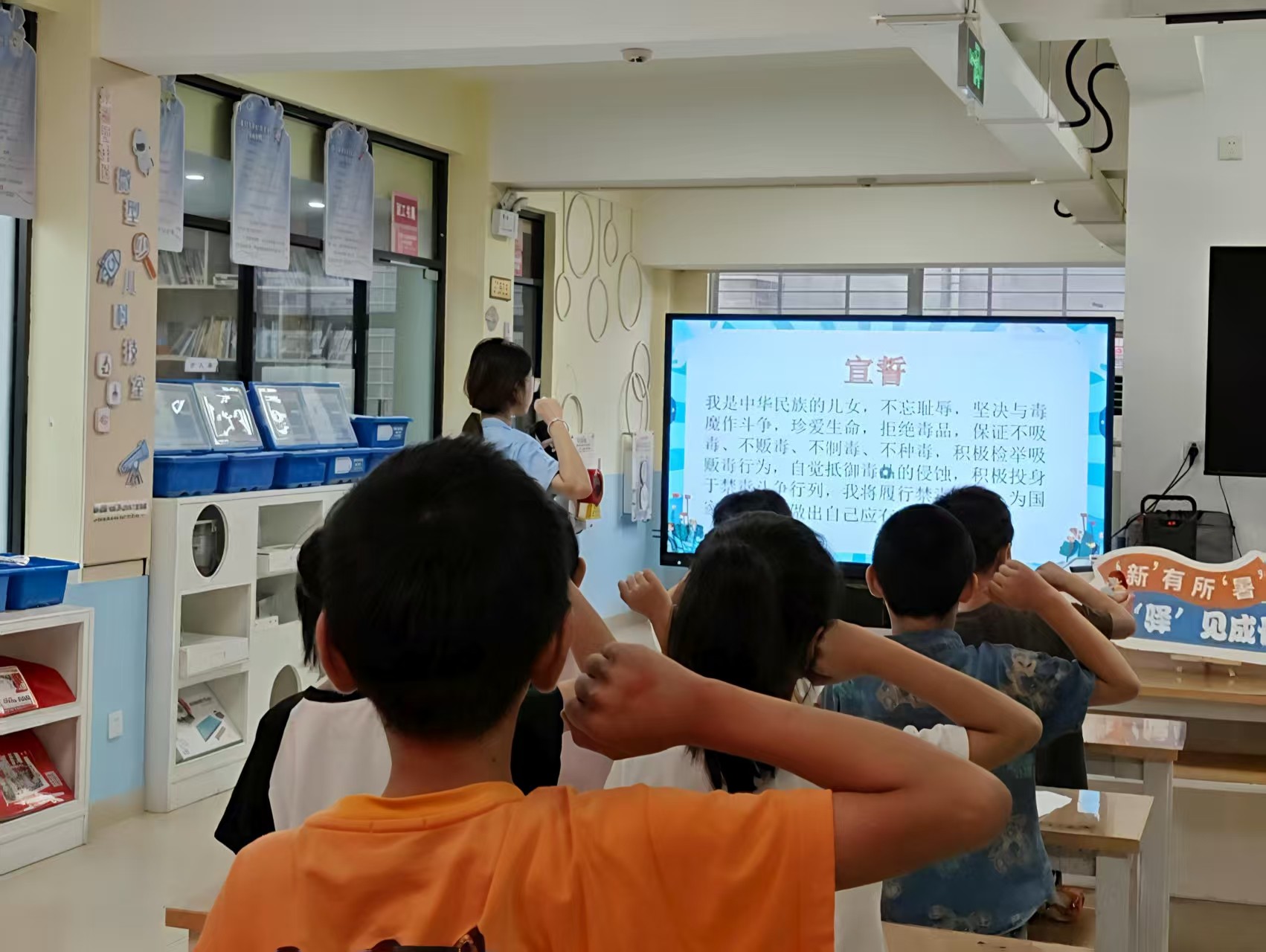 实践队在永福里社区新时代文明实践站与青少年们一同开启拒毒之旅。队员们通过通俗易懂的讲解和生动的案例视频,详细地讲述了毒品的危害以及如何进行自我防御课堂上,通过“幻视眼镜”“以画拒毒”等寓教于乐的互动游戏,让小朋友们在轻松愉快的氛围中学习拒毒技能,增强自我保护意识,为青春生命筑起一道坚实的安全防线。