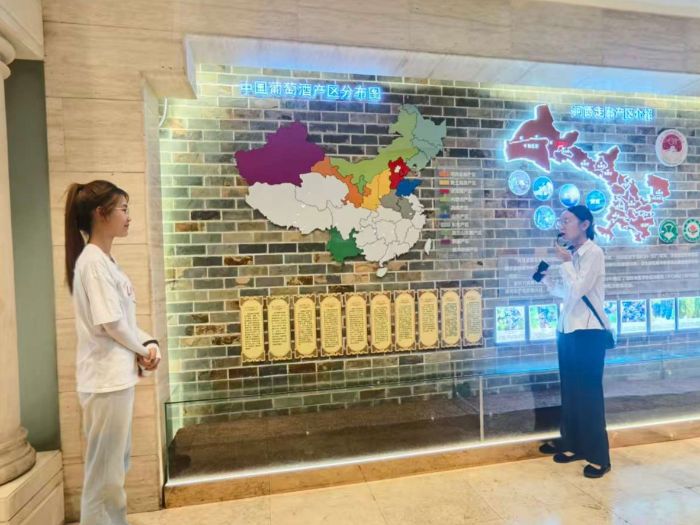 图为工作人员为团队成员讲解葡萄酒产区和制作流程 王嘉仪供图