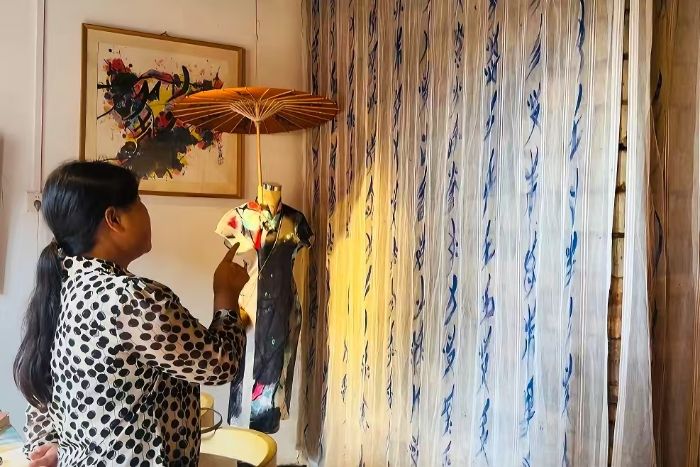 在文创展厅,琳琅满目的展品让成员们眼前一亮:折扇上,女书字符旁卧着一只憨态可掬的小猫咪,水墨笔触灵动鲜活,字符的古朴与猫咪的俏皮相映成趣;银质首饰上,微型女书符号精致灵动;棉布袋上,彩色丝线绣的女书短句充满生活气息;最引人注目的是复刻的女书婚书,红底金字,既保留传统韵味,又添了现代设计感。