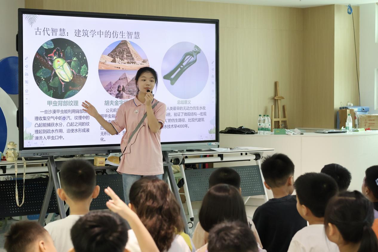 科创科普特色活动课程中,支教队队员以趣味化方式解析科学原理与创新案例,内容涵盖沙漠甲虫背部纹理集水的生物特性、胡夫金字塔的建筑智慧等多元领域,有效激发儿童对科学与创新的好奇心。教学过程中,队员注重引导儿童进行观察、思考与探究,培育其对知识的热爱与探索精神。