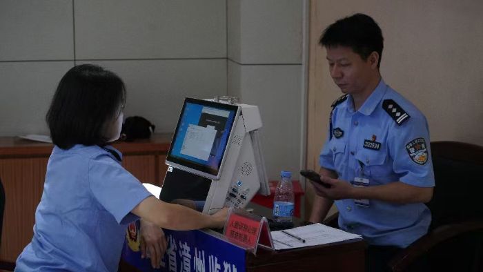图为实践队员为民警进行人脸识别筛查 中央司法警官学院 马致远摄