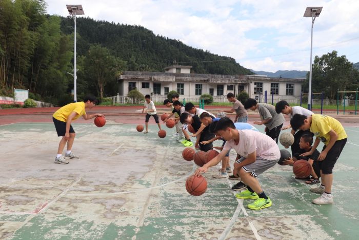 图为实践团成员在体育课上教孩子们篮球技巧 伍英桃摄