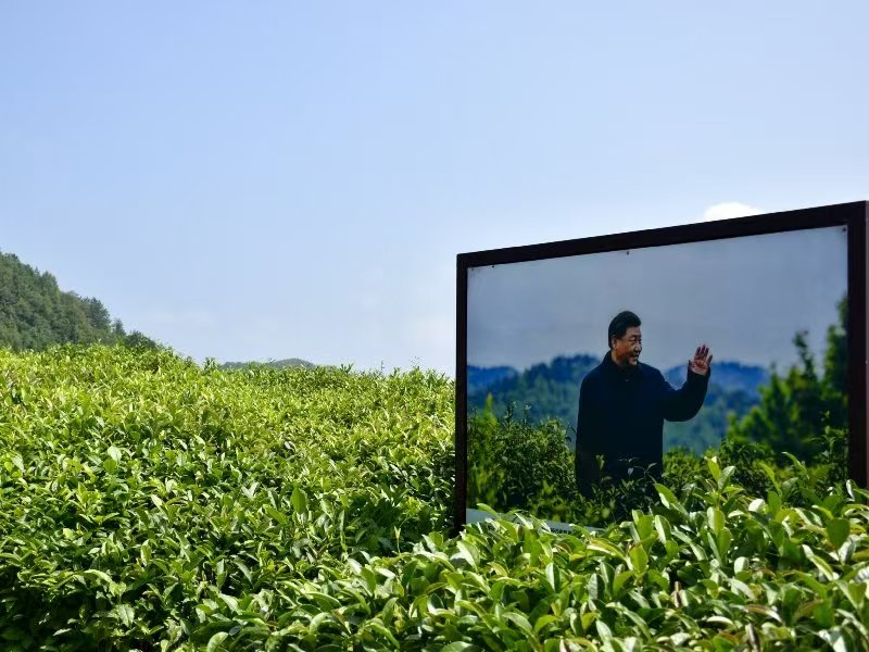 二、生态与产业共生:总书记嘱托下的绿色发展实践 "人不负青山,青山定不负人。"2020年习近平总书记考察蒋家坪村时的嘱托,已成为当地发展的根本遵循。团队来到女娲凤凰茶业现代示范园进行调研、观光,沿着茶园内的观光步道前行,欣赏成片的茶树在山坡上随风摇曳的美景,感受茶园的生态魅力。
