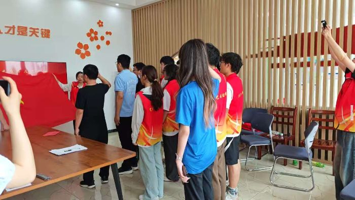 7月1号上午团队来到了砀山县李庄镇。在李庄镇干部的安排下,有幸与合肥经济学院的实践团队以及团县委镇村干部齐聚一堂,参加了“我在李庄过七一”--“红心向党共话振兴”青年高校人才座谈会。在会上,两支团队围绕自己的所见所闻踊跃发言,结合实践经历,或是利用专业所长,畅谈如何利用数字计划技术优化酥梨产业链,或是分享在镇上田街与老乡交流的暖心故事寻找乡风文明建设的新方法。砀山县团县委副书记对两支高校三下乡团队深入乡村实践的热情和思考给予了充分肯定,也向团队介绍了李庄镇的发展和现在的情况。一句“要让农村更像农村”的宣传标语,深深的烙印在脑海中。在会议最后,随着状元的音乐声响起,全体青年党员预备党员以及积极分子肃然起舞,紧握右拳,面向鲜红的党旗,庄严的宣誓。“我志愿加入中国共产党!”这铿锵有力的话回荡在室内,也更加坚定了大家扎根基层,服务乡村的信念。