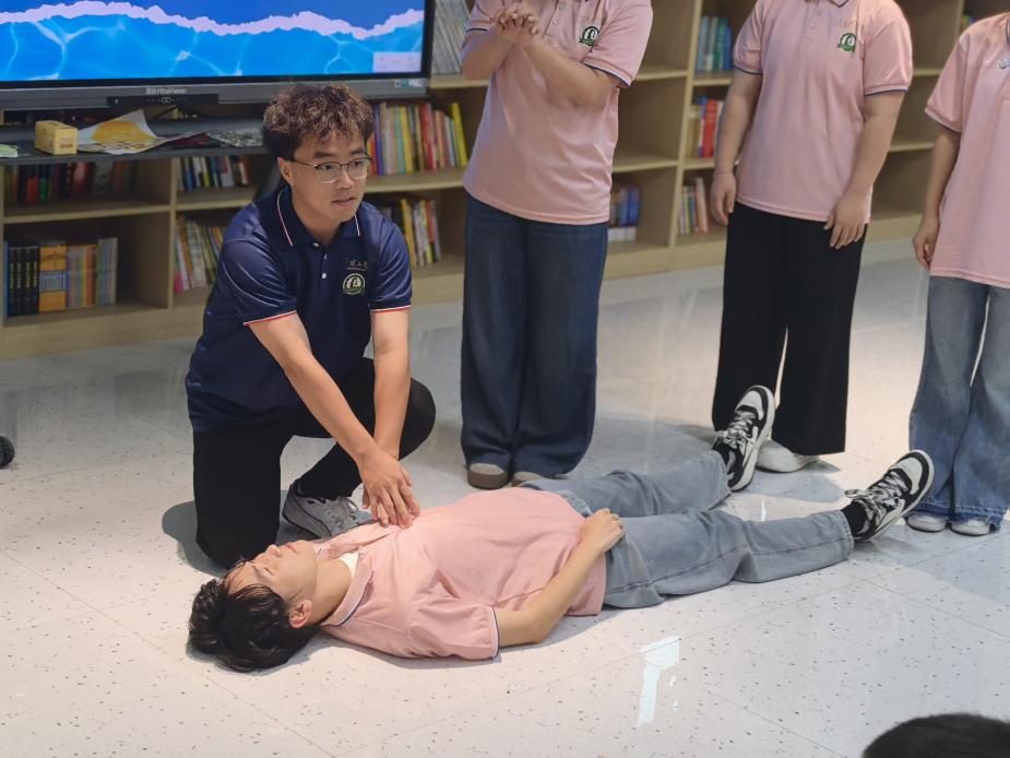 防溺水情景小剧场,通过模拟“同伴邀约前往陌生水域”“发现落水者错误施救与正确处置”等场景,以直观演绎帮助儿童深刻理解危险行为的后果及正确应对方法。同时,支教队队员们在小剧场中进行规范的心肺复苏动作示范,配合清晰的语言引导,助力儿童记忆关键急救知识,进一步巩固安全认知。